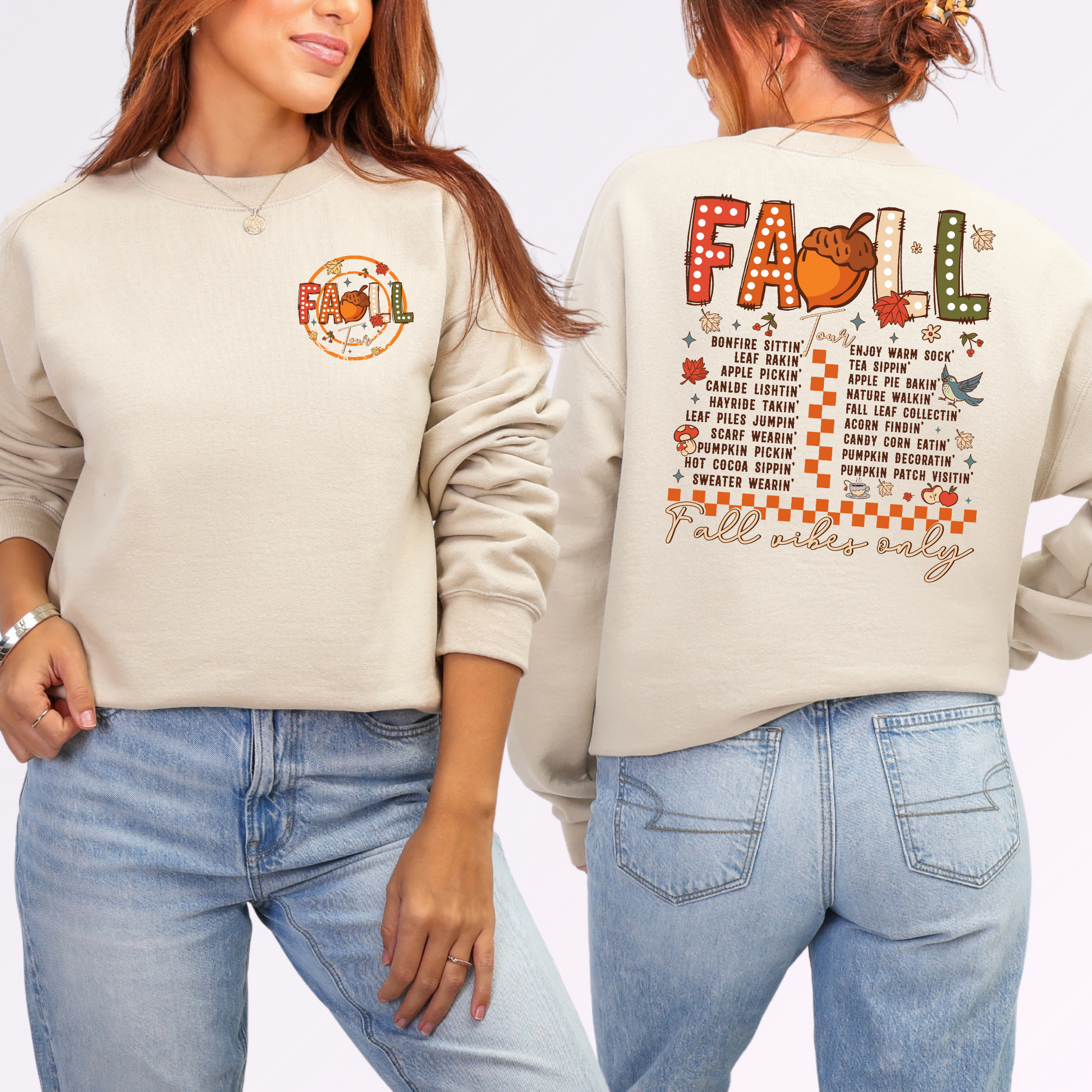Celebrate cozy season in style with this Fall Vibes Only sweatshirt! Featuring a small front graphic and a bold back design with all your favorite autumn activities—pumpkin picking, bonfires, hayrides, and more—this cozy sweatshirt is perfect for cooler days. Made with soft, breathable fabric, it’s a must-have for anyone who loves all things fall.