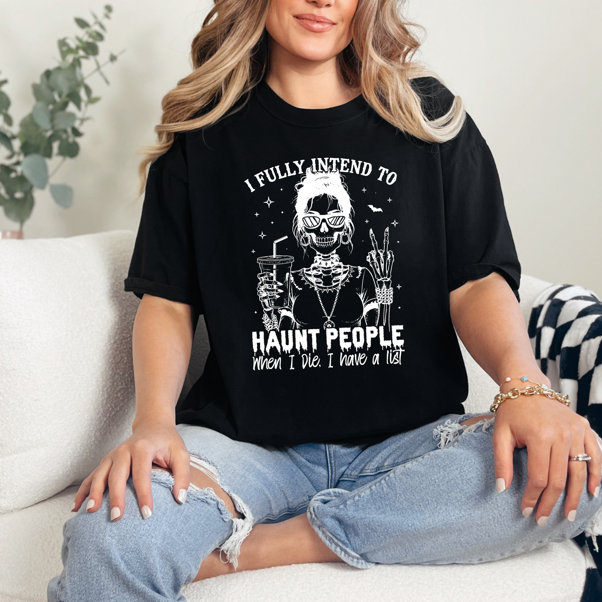 Add some spooky sass to your style with this Haunt People graphic tee. Featuring a skeleton with shades, iced coffee, and plenty of attitude, this shirt is perfect for Halloween lovers who enjoy a bit of humor. Made with soft, breathable fabric for all-day comfort.